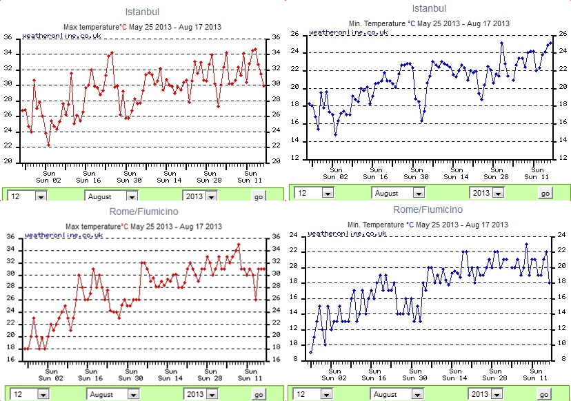25 Mayıs’tan beri İstanbul’un maksimumları 22 derecenin altını görmemişken, Roma’da sıcaklık 18 dereceye kadar düşmüş. Minimumlar ise son 3 ayda İstanbul’da 15 derecenin altını görmemişken, Roma’da 9 dereceye kadar düşmüş. En yüksek gündüz sıcaklığı İstanbul’da da Roma’da da 35 derece olmuş; ancak Roma’da 30 derece ve üzerinde maksimum sıcaklığın ölçüldüğü günlerin sayısı 34 iken, İstanbul’da 44 olmuş. Roma’da 20 derece ve üzerinde minimum sıcaklığın ölçüldüğü gün sayısı 23 iken, İstanbul’da tamı tamına 57(!) olmuş.