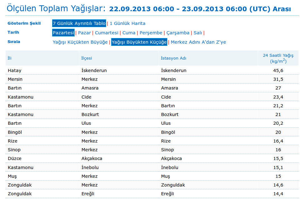 MGM’nin, şu sayfada yayınladığı günlük toplam yağış değerleri ile, şu sayfada yayınladığı otomatik istasyon verileri birbirini tutmuyor. Ayrıca, otomatik istasyonlarda kaydedilen yağış değerlerinin tamamı, günlük toplam yağış değerleri sayfasında listelenmiyor.