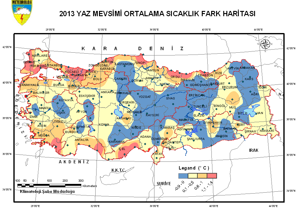 Aşağıdaki haritalardan da görüleceği üzere 2013 yazı, bizim de beklentilerimize paralel olarak, Türkiye’nin çoğu yerinde mevsim normallerinde geçti (1981-2010 yılları arasındaki ortalamalara göre).