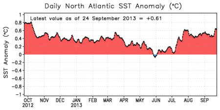 Yukarıdaki NAO endeksi tablosuna baktığımızda, Eylül’ün ilk yarısına kadar çoğunlukla pozitif bir seyir izleyen endeksin, son bir haftadır sert bir şekilde negatife doğru meyletmiş durumda olduğunu görüyoruz. Bunu da, harareti bir türlü dinmek bilmeyen Kuzey Atlantik su sıcaklıklarına bağlayabiliriz. Aşağıdaki tabloda son 1 senelik durumu görebilirsiniz. Aşırı olmasa da, ciddi bir pozitif anomali göze çarpıyor.