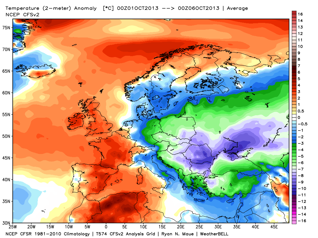 Çeşitli model çalıştırmaları, Ekim ayı ortalarına doğru Orta-Batı Avrupa civarına yerleşecek yeni bir yüksek basınç merkezinin ve dolayısıyla kıtaya inecek yeni bir soğuk hava dalgasının sinyalini veriyor. O sistem büyük bir ihtimalle Batı Avrupa’yı etkileyecek gibi görünse de, 2013 Ekim ayı, bizim de içinde bulunduğumuz Güneydoğu Avrupa’da büyük bir ihtimalle mevsim normallerinin altında kapanacak.