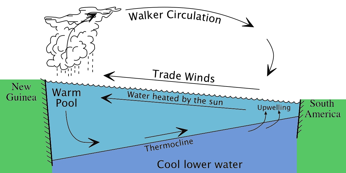 Sol taraf (batı) Avustralya tarafı, sağ taraf (doğu) Güney Amerika tarafı. Normal vaziyet. Alize rüzgarları (Trade Winds) yüzeyin ılık sularını batıya sürüklüyor, sürüklenen suların yerini dipten gelen (upwelling) soğuk su alıyor. Asayiş berkemal.