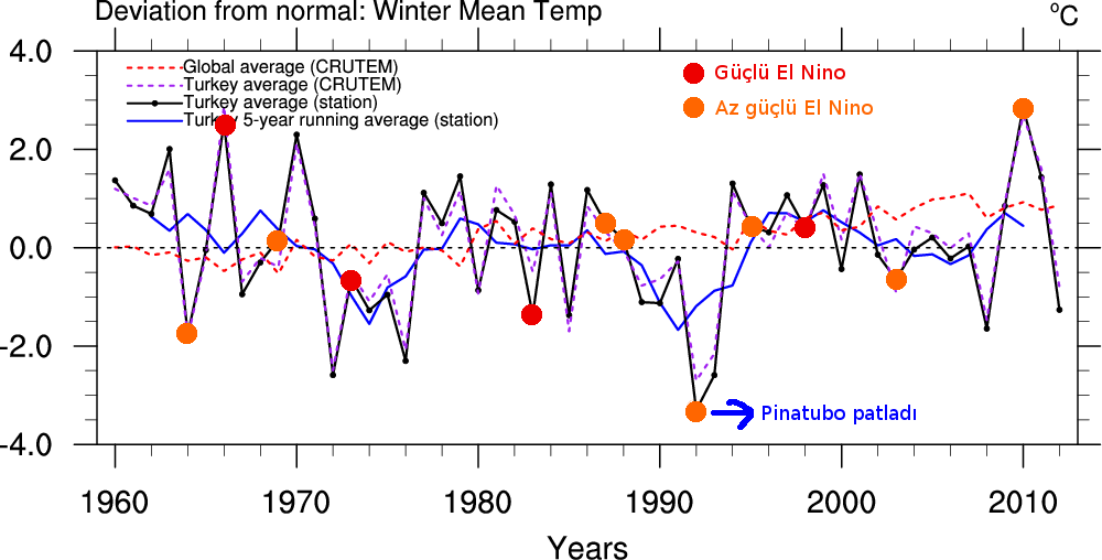 Mesela aşağıdaki grafiğe bakalım. Siyah noktalar ve aralarındaki siyah çizgi, Türkiye’nin kış sıcaklıklarının (birçok istasyonun ortalaması), yıllar içindeki seyrini gösteriyor (değerler ‘mevsim normalinden fark’ olarak veriliyor). El Niño’nun güçlü ve az güçlü olarak gözlendiği yılları da sırasıyla kırmızı ve turuncu renklerle belirttim.