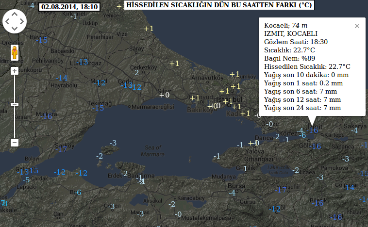 yeniHissedilen sıcaklıklar, sıcaklıkların ve hissedilenlerin dünden farkı gibi sizi meraktan öldüren meteorolojik değişkenleri Google Haritalar üzerinde gösteriyoruz… Yakında başka diğer değişkenler (örneğin mevsim normallerinden farklar vb.) ve istasyon grupları ile zenginleşecek… Meraklılar şimdilik bu “beta” versiyondan faydalanabilirler.
