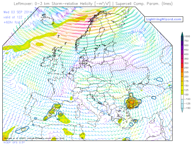 TSİ 18:00 için hesaplanmış olan Süper Hücre Bileşik Parametresi (Renkli Kalın Çizgiler) İstanbul’un Avrupa yakasını işaret ediyor..