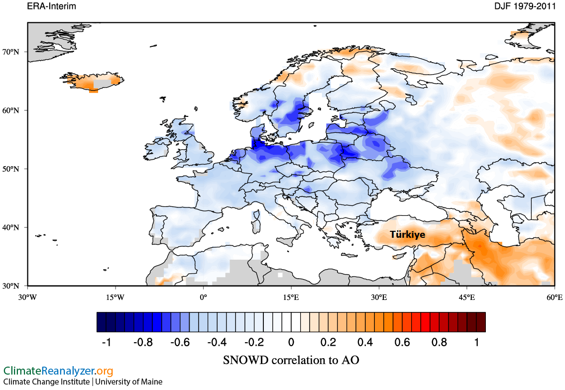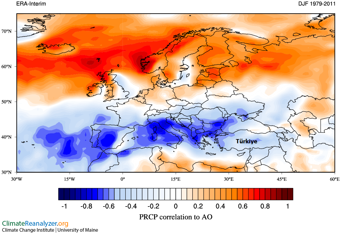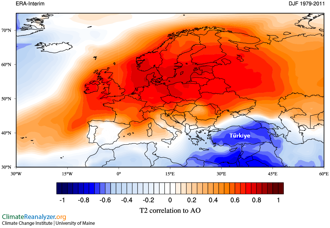 AO ile yer seviyesi sıcaklığı arasındaki korelasyon aşağıda. Türkiye’nin büyük çoğunluğunun mavi tonlarda olması, korelasyonun negatif (ters) olduğunu, yani AO indeksi ne kadar negatife inerse Türkiye’nin büyük kısmında kış sıcaklıklarının ORTALAMASININ normalden o kadar yüksek olacağını gösteriyor. Sadece Trakya’nın nötr zonda olduğunu görüyoruz, bu demek oluyor ki AO’nun pozitif veya negatif olması sıcaklık bakımından en az bu bölgemizi etkiliyor.