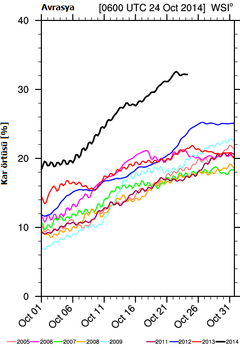 24 Ekim itibariyle gerçekleşen Avrasya kar örtüsünün yüzde olarak geçmiş yıllarla karşılaştırmasını da aşağıda görebilirsiniz. Ciddi miktarda bir fazlalık var. (Kaynağa ulaşan Ariftarif’e teşekkürler).
