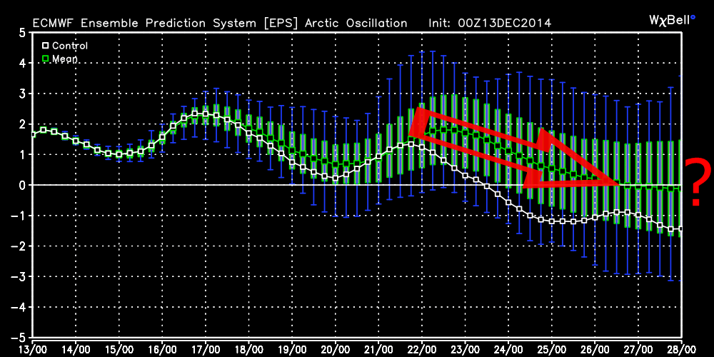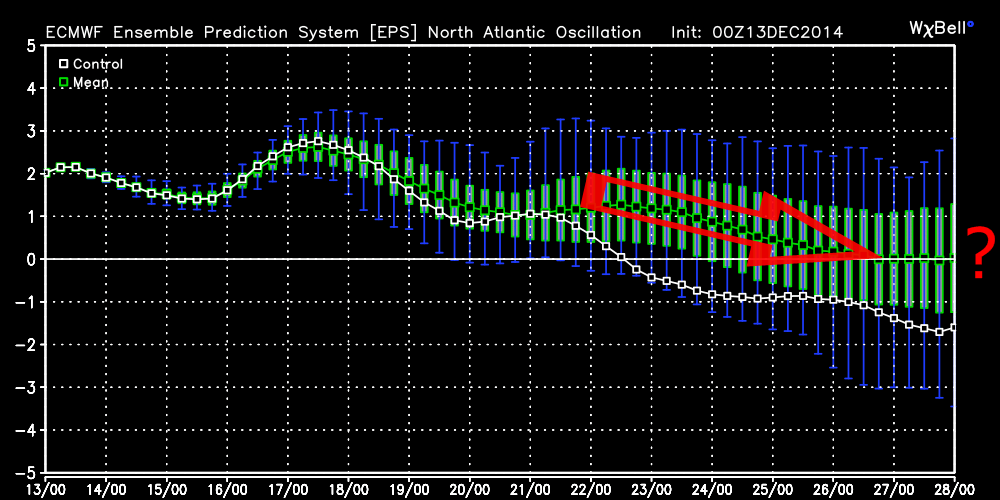 Yukarıdaki diyagramlarda nötre doğru gidişin yanı sıra dikkat çekilecek nokta endeksin çizdiği zik-zak hareketi. Bu iniş çıkış hareketi ve dalgalı seyir, Azor’un kuzey enlemlere çıkışına ve güneye inişine, bu da Avrupa Kıtası’nda 21/22 ve 27/28 Aralık tarihlerinde olası sistemlere işaret eder.