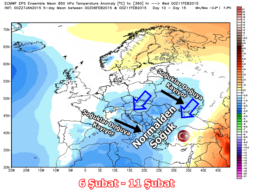 Avrupa Modeli’nin (ECMWF) 11-15 gün arasındaki 850 hPa sıcaklığı normalden sapma haritaları da bunu işaret ediyor.