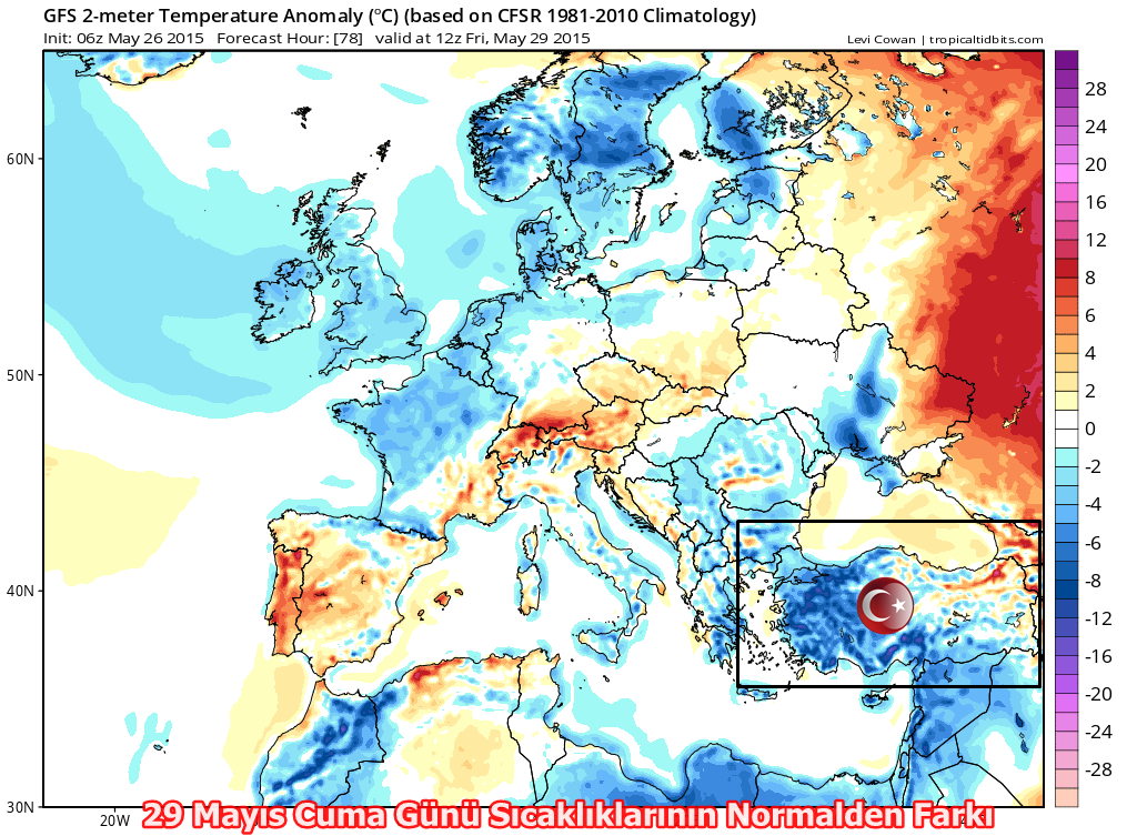 Mesela aşağıdaki haritada Cuma günü ölçülecek sıcaklıkların mevsim normallerinden farkı veriliyor, gördüğünüz gibi Türkiye’nin batısı normallerden 4 ila 10 derece serin.