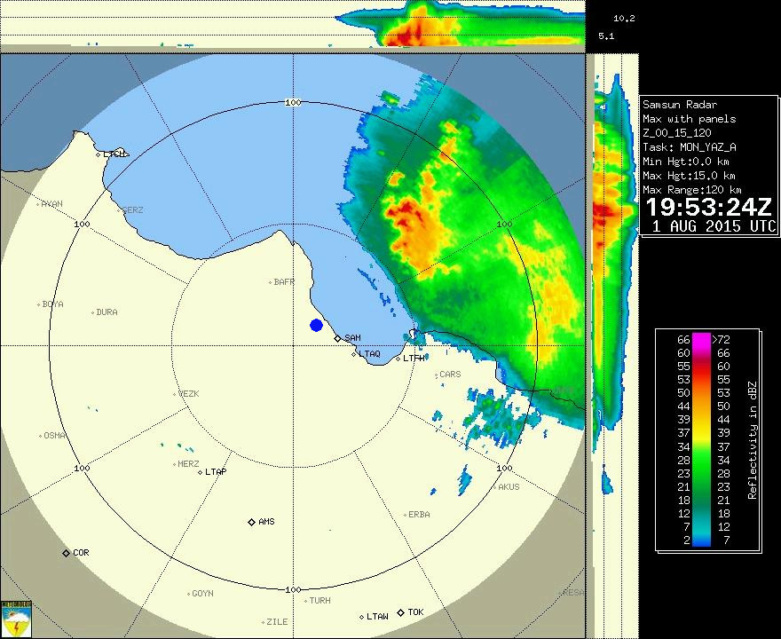 Gördüğünüz gibi ben bu satırları yazarken deniz üzerinde kopan kıyamet birkaç saat önce şehrin doğusunda, Terme civarında kopmuş, yaklaşık 2 saatte 94 mm yağmur düşmüş!