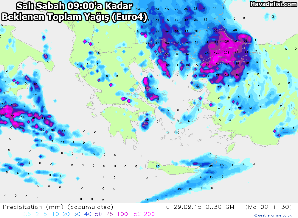 Sabahki ECMWF Salı günü için siklonu Batı Karadeniz’e çıkartıp bir quasi tropikal siklon senaryosu veriyor. Euro4 ise Sakarya-Kocaeli arasında konumlandırıp Marmara’nın Doğusunu yağışa boğmuş.