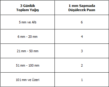 * Yağışı tam bilirseniz 50 puan alacaksınız. Toplam yağış miktarlarını aşağıdaki tabloda gördüğünüz gibi gruplara ayırdık ve her bir gruba bir sapma katsayısı belirledik. Puanlar hesaplanırken ölçülen toplam yağışın miktarına göre tabloda yazan sapma puanları kullanılacak.