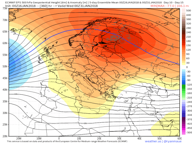 26-31 Ocak arasını gösteren ECMWF Ensemble 500 hPa jeopotansiyel yükseklik anomalisi (26-31 Ocak arası)