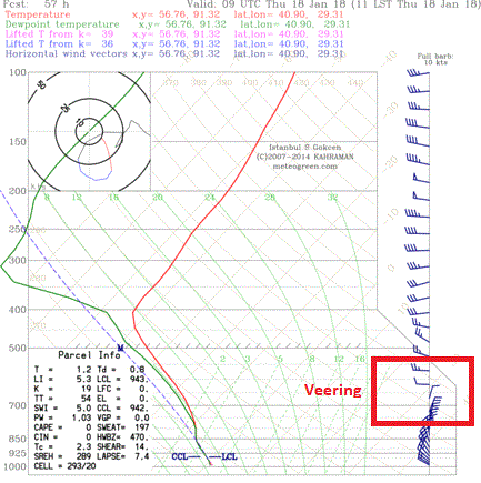 700 mb üstünde rüzgarın batıya dönmesi ve yukarı doğru kuvvetlenmesi de cephe geçişi sırasında dikey bulut oluşmasına son noktayı koyuyor. Rüzgarın doğulu yönlerden batıya dönmesi; havayı saat yönünün tersine döndürerek yükselten ve yazın süper hücrelerde görülen “veering” hadisesine zemin hazırlayan bir rüzgar profiline işaret ediyor. Bu sebeplerle Perşembe günü cephe geçisi sırasında ve yağış kara döndüğünde de gökgürültüleri işitmemiz, 12 Ocak 2015’te olduğu gibi, sürpriz olmayacaktır.