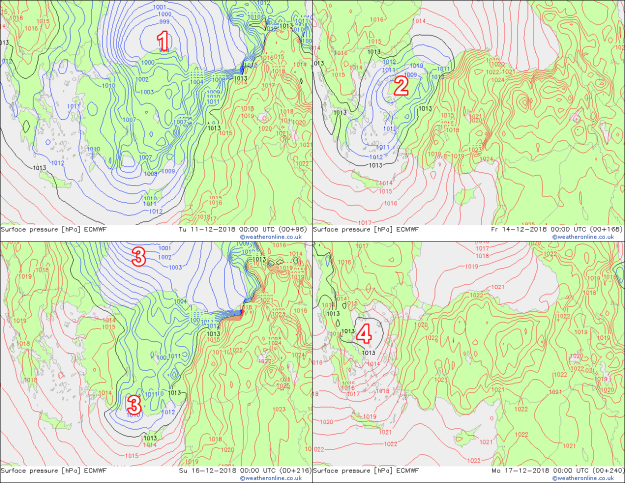 Bu sabahki ECMWF çıktısına baktığımızda önümüzdeki 10 gün içerisinde tam dört tane İzlanda kökenli siklonun (değişim ihtimali tabii ki var) ülkemizi etkileyeceği ve bu siklonların kuzeye ve doğuya doğru ilerlemesiyle, Balkanlar üzerinden soğuk havaların bize doğru geleceğini söyleyebiliriz. Bu sistemler Atlantik kökenli olduğundan, beraberinde getirdiği soğuma kıyılarda yağmur dışında bir hava olayına yol açmıyor, fakat dağlar ve iç bölgelerin yüksek illeri kar yağışları alacaktır.
