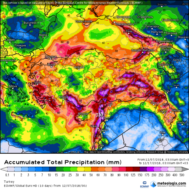 ECMWF 00Z çalıştırması (07.12.2018) – Önümüzdeki 10 gün boyunca toplam yağış miktarı