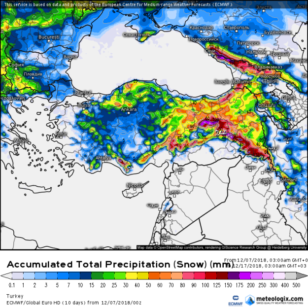 ECMWF 00Z çalıştırması (07.12.2018) – Önümüzdeki 10 gün boyunca toplam kar yağışı miktarı