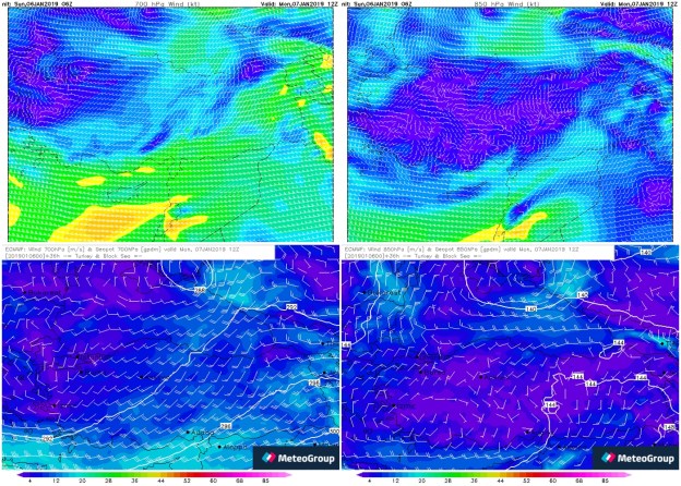 GFS ve ECMWF modellerinde, Karadeniz üzerindeki rüzgar değişimleri, 850 hPa seviyesindeki rüzgar hafifliği ve atmosferin diğer katmanlarındaki rüzgar yönlerinin birbirleri ile uyumsuzluğu; bize DEK kütlelerinin sığ olacağını ve de güneye inmekte biraz zorlanabileceğini gösteriyor.