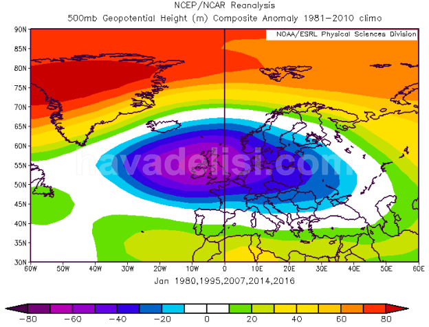 Aralık ayında kuvvetli pozitif NAO görülen yılları sırasıyla haritaya döktüğümüzde ise şaşırtıcı bir durum keşfettik (belirgin bir örüntü olmayan yılları haritaya eklemedik). Bazı yıllarda Orta Avrupa üzerinde bir yüksek basınç görülürken, bazı yıllarda şu andaki Aralık ayında olduğu gibi Azor Yüksek basıncı batıda konumlanıp Orta Avrupa’da alçak basınç hakimiyeti görülmüş. Yani kuvvetli NAO endeksini baz alıp tek yönlü bir tahmin yapmanın doğru olmayacağını, bunun Avrupa üzerinde iki farklı fazda seyrettiğini söyleyebiliriz.