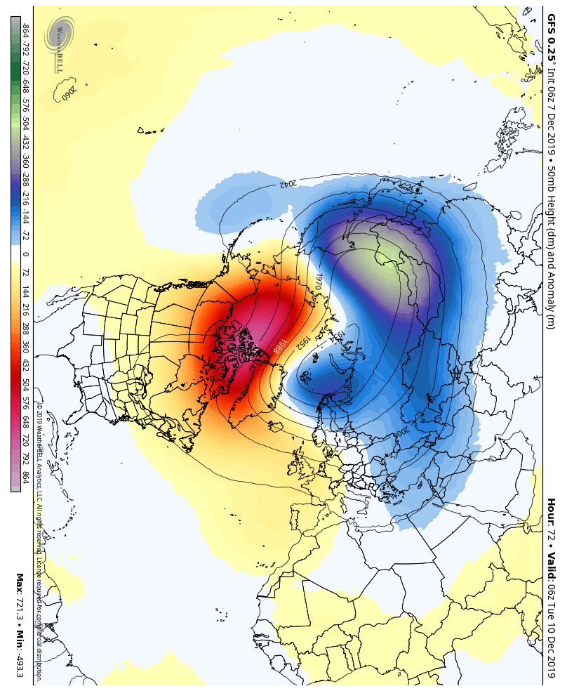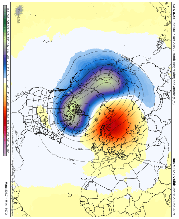 İnanmasak da onsuz olmuyor, GFS uzun vadesine baktığımızda 240. Saate kadar ECMWF verisine benzer bir görüntü var. Devamında ise güç kazanmış kutupsal girdabın Aralık ayı başındaki gibi Kuzey Avrasya’ya değil, Kanada-Grönland arasına yerleşmeye çalıştığı görülüyor. Avrupa’da ise pozitif anomaliler dikkat çekiyor.