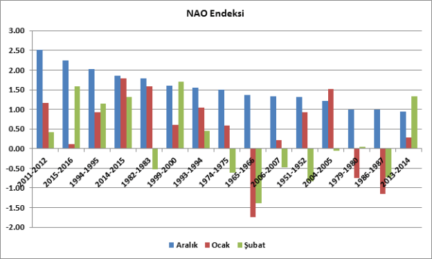 Aralık aylarının kuvvetli pozitif NAO (+1 civarı ve üzeri) ile geçtiği yılları listeleyip, takip eden Ocak ve Şubat ayları ile birlikte grafiğe döktüğümüzde aşağıdaki görseli elde ediyoruz.