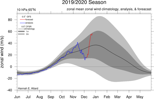 GFS ve onun demet ortalaması GEFS sayısal modelleri, Kasım ayı son günlerinden itibaren yukarı seviyelerde zonal rüzgarların zayıflamasıyla hatta ters dönmesiyle beraber kutupsal girdabın dağılmasına (negatif AO-NAO) sebep olacak bir ani stratosfer ısınması işaretleri veriyordu. Ancak işler şimdilik negatif AO lobisinin beklediği gibi gitmemiş gibi görünüyor. Kutupsal girdap kendisine yapılan bu ilk saldırıyı bertaraf edip tekrar güçlenmeye başladı (=Pozitif AO-NAO rejimi).