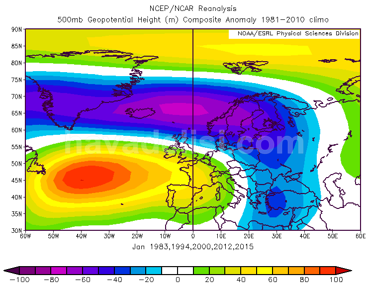Fazlara ayırdığımız pozitif NAO rejiminin, Ocak ayında aşağıdaki şekilde yer alan faza benzeyebileceğini öngörmüştük.
