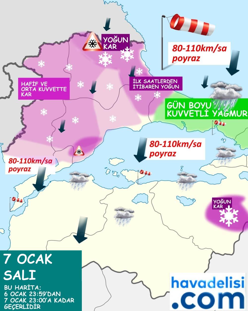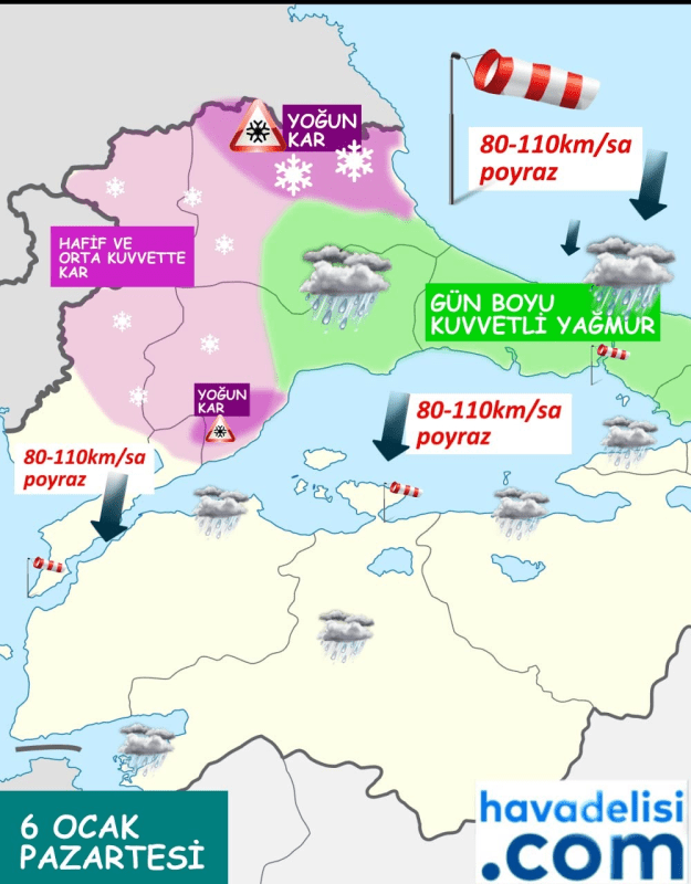 İstanbul ve Çanakkale boğazları başta olmak üzere Marmara ve Ege’de poyraz sürekli olarak 50, hamlelerle birlikte 110km/saate kadar etkili olabilecek. Bu sebeple çatı uçmaları, ağaç devrilmeleri, tabela uçması gibi vakalara karşı tedbirli olunuz. Birçok iç ve dış hat vapur seferlerinin de iptal olmasını öngörüyoruz.