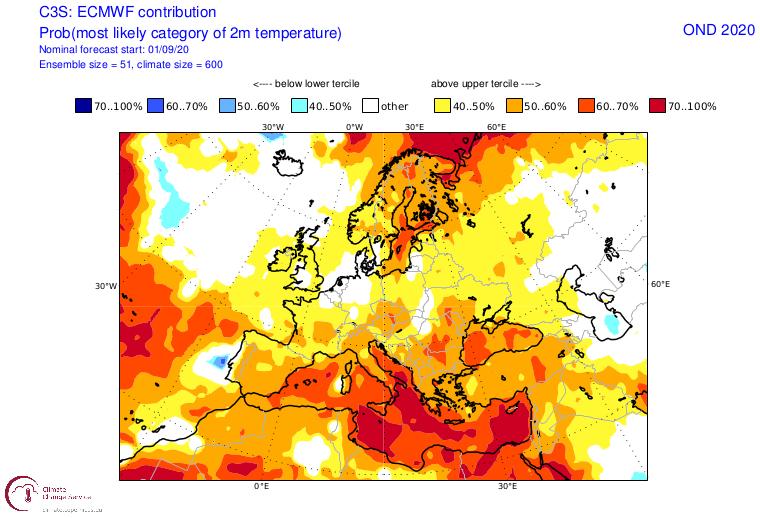 ECMWF ekim-kasım-aralık sıcaklık anomalisi (normalden fark) olasılık haritası. Turuncu-kırmızılar sıcaklığın normalden yüksek olma olasılığının fazla olduğu yerleri gösteriyor.