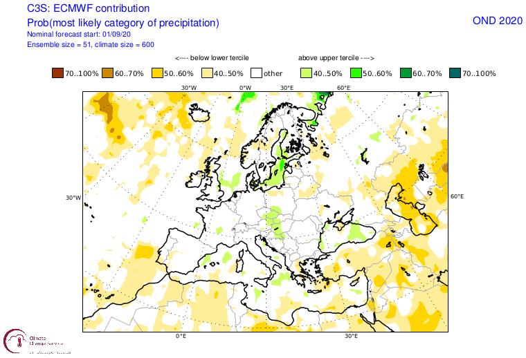 ECMWF ekim-kasım-aralık yağış anomalisi (normalden fark) olasılık haritası. Sarı-turuncular yağışın normalden az olma olasılığının yüksek olduğu yerleri gösteriyor.