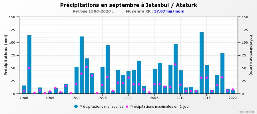 İstanbul Atatürk Havalimanı istasyonunda eylül ayı yağışlarının yıllar içindeki seyri (mavi çubuklar). Her yıl eylül ayı içerisinde düşen günlük maksimum yağışlar da mor noktalarla gösteriliyor. Kaynak: infoclimat.fr