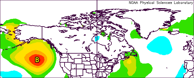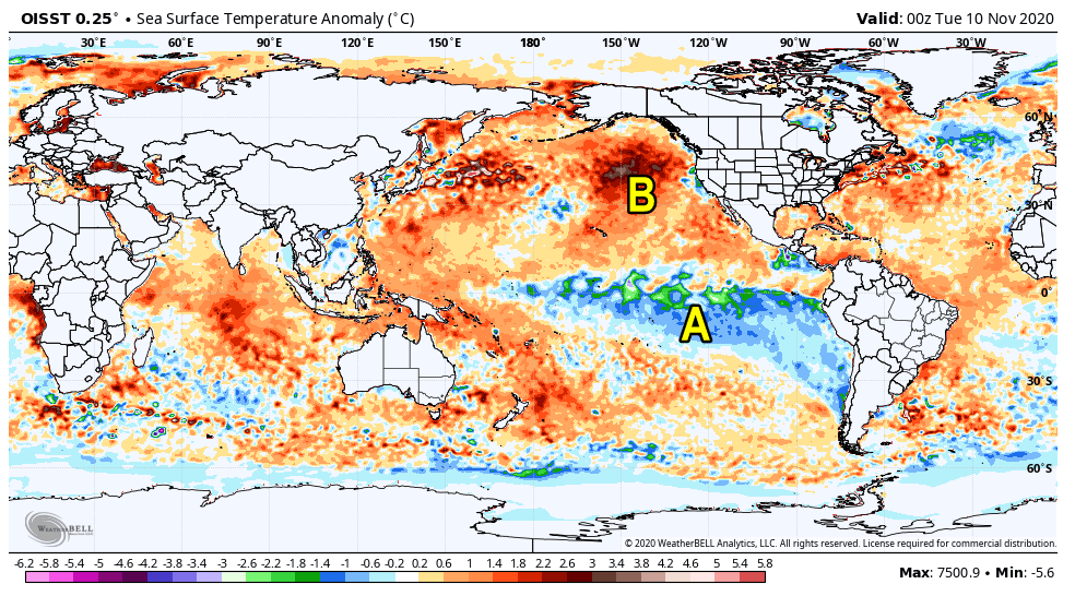 10 Kasım 2020 tarihi itibariyle küresel çapta deniz suyu sıcaklıklarının normalden farkını aşağıdaki haritada görebiliyoruz. A ile işaretli olan bölge Ekvatoral Pasifik (ENSO), B ile işaretli olan bölge ise Kuzeydoğu Pasifik.