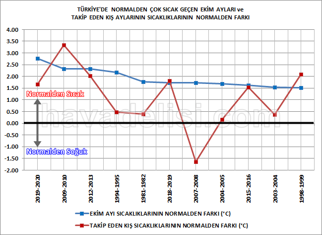 Rekorlar kırılan sonbahar aylarından ilham alarak, Ekim ayı başlarında bir istatistik çıkarmıştık. Bu istatistiğe göre, normalden çok sıcak geçen Ekim aylarını takip eden kışların neredeyse tamamında (11 kıştan 10 tanesi) sıcaklıklar uzun yıllar ortalamalarının üzerinde geçmiş.