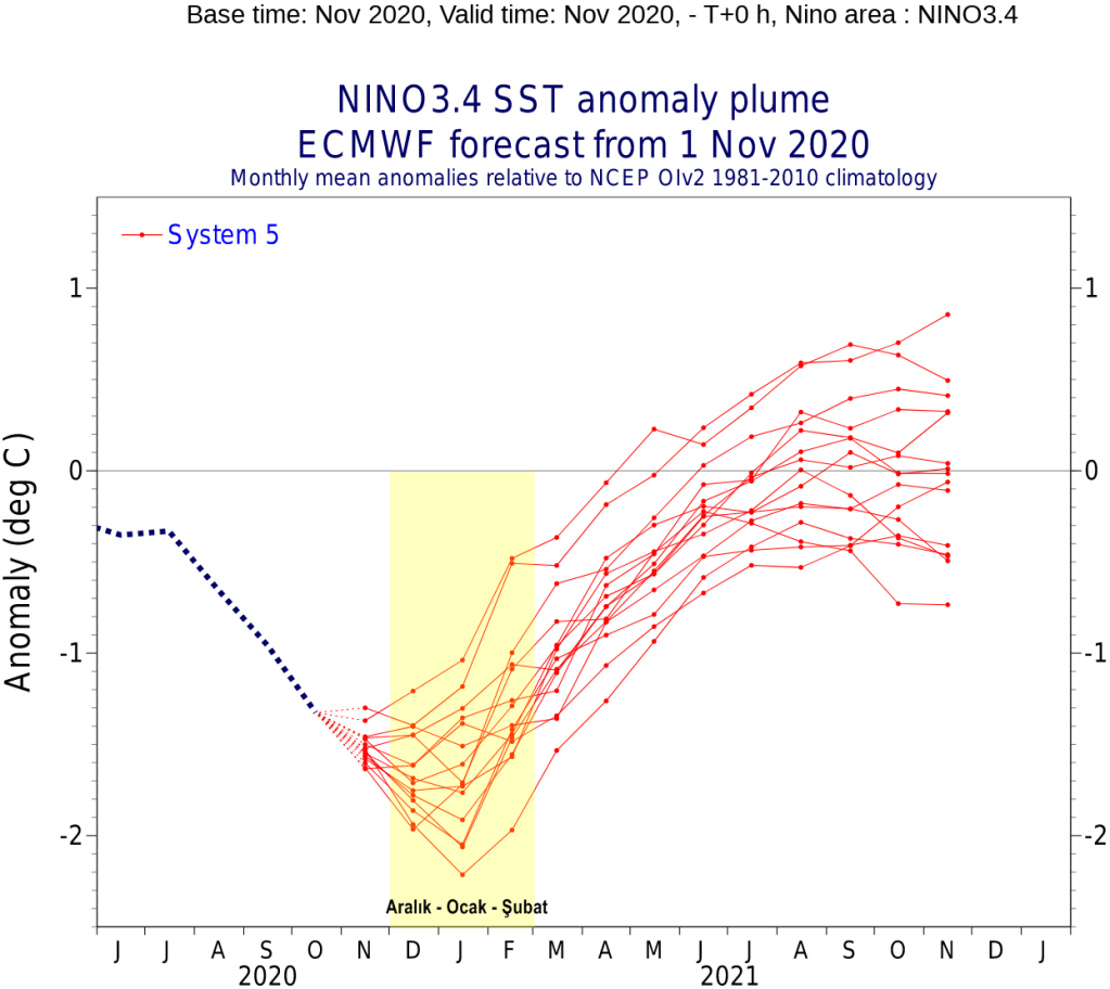 ECMWF mevsimlik tahminine baktığımızda hali hazırda aktif olan La Nina’nın, kışa doğru etkisini iyice arttıracağını ve kuvvetli hale geleceğini görüyoruz.