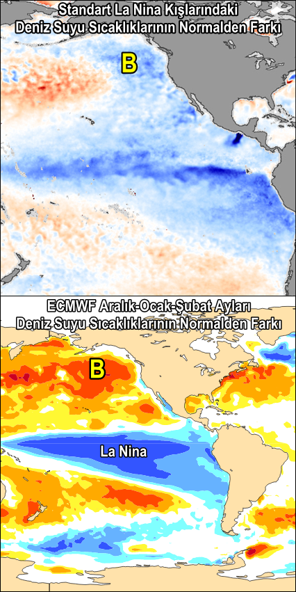 Deniz suyu sıcaklıklarını geçmeden önce, ilk haritada işaretlediğimiz “B” noktasına değinelim. Burada su sıcaklıklarının normalden ciddi oranda yüksek olduğunu görüyoruz demiştik. Bu bölgeyle ilgili kafamızı kurcalayan bir nokta var. Aşağıdaki görselde normalde La Nina kışlarındaki su sıcaklıkları dağılımını ve önümüzdeki kış beklenen su sıcaklıkları dağılımını birlikte görüyorsunuz. Şimdi çokomelli şeyler geliyor…