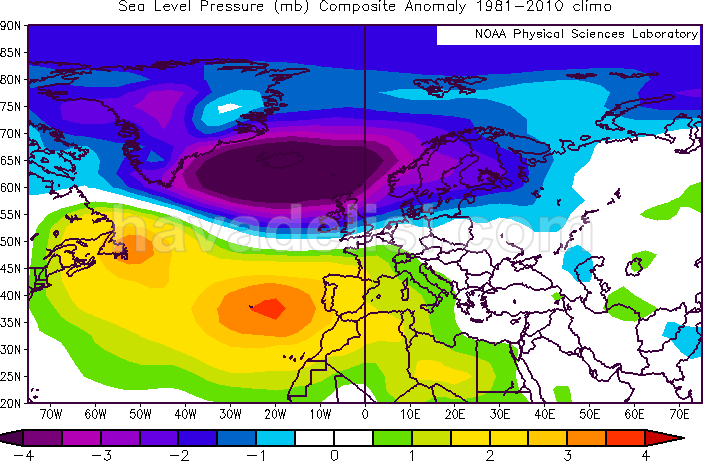 Yani son 10 yılda İzlanda civarındaki alçak basınç alanları önceki 10 yıla nazaran çok daha kuvvetli hale gelmiş. Aynı şekilde Azor Yüksek Basıncı da (İspanya’nın batısındaki turuncu bölge) güçlenmiş. Azor ve İzlanda arasındaki basınç farkının bu şekilde ortalama üstü seyretmesine Kuzey Atlantik Salınımı’nın (NAO’nun) pozitif fazı deniyor, ve böyle olunca kutup soğukları Avrupa’ya, özellikle de kuzeyine ve batısına çok daha az sokulabiliyor. Pozitif fazın son 10 senedeki ısrarının sebebi küresel ısınma mı, düşük güneş aktivitesi mi yoksa başka bir şey mi onu net olarak söyleyemiyoruz.