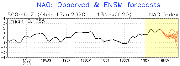 Aşağıdaki görselde şu ana kadar gerçekleşen ve önümüzdeki 15 günün tahminini içeren NAO endeksi değerini görüyorsunuz. Bu veri ve diğer orta vadeli tahminlere göre Kasım ayı çok büyük bir ihtimalle pozitif NAO ile kapanacak. Buradan da 2021 kışı için pozitif NAO sinyali geliyor.