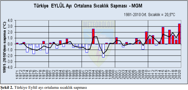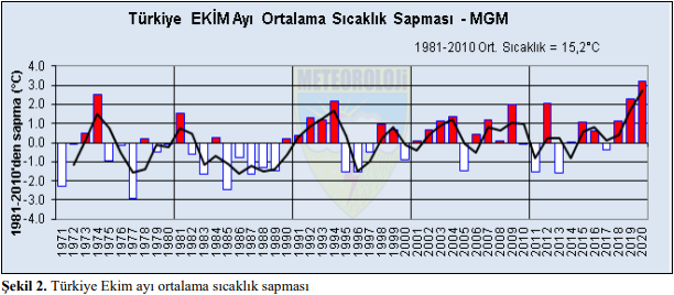 Küresel ısınmanın etkileri son birkaç senede tüm Dünya’da iyice belirginleşmeye başladı. Biz de Türkiye olarak payımıza düşeni, yaz mevsiminin hem ilkbahara hem sonbahara doğru uzaması, bunun yanında eski yazlara nazaran artan şiddetli hava olayları ve uzun süreli sıcak hava dalgalarıyla alıyoruz. Bu yıl küresel ısınmayla birlikte atmosferik örüntülerin de uzun süre bizi sıcak tarafta bırakmasından ötürü Ekim ayı sonlarına kadar neredeyse 5 ay kesintisiz yaz yaşadık. Bunun sonucunda 2020 yılının Eylül ve Ekim ayları, aşağıdaki görsellerden de görüleceği üzere, MGM tarafından 1971 yılından beri tutulan kayıtlara göre ülke genelinde son 49 yılın ayrı ayrı en sıcak eylül ve ekimi oldu. Bu aşırı sıcaklara yurdun büyük kesiminde kuraklık da eşlik etti.