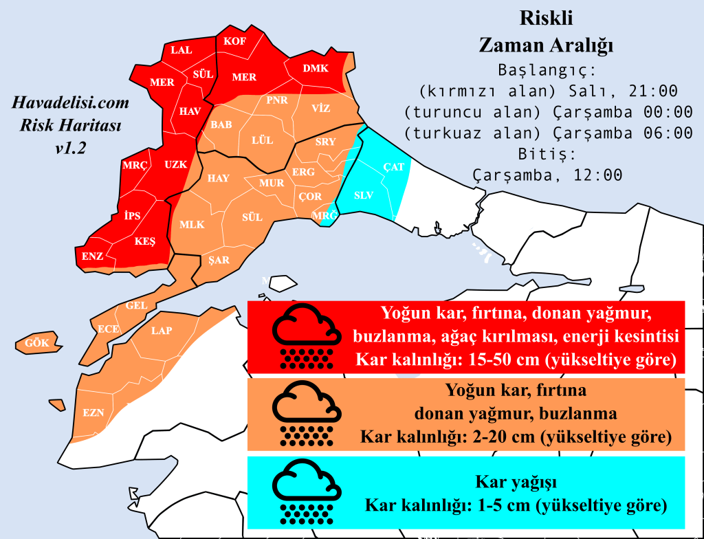 Çarşamba sabah saatlerinde Trakya’ya yakın ilçelerin yüksekleri (Silivri, Başakşehir, Beylikdüzü, Çatalca) yağışları karla karışık yağmur ve kar olarak almaya başlayabilir. İlerleyen saatlerde güçlü karayel önce Avrupa yakasının tamamı ve ardından Anadolu yakasında da sıcaklıkları düşürecek ancak sahillerde bir ihtimal lapa lapa yağacak kardan öte bir etki yaratacağını düşünmüyoruz. İstanbul’da kalıcı örtü 150-200 metre ve üzeri rakımda mümkün olabilir.