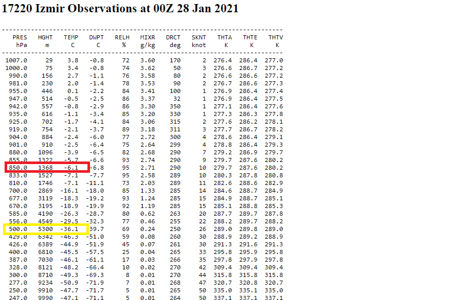 İzmir 28 Ocak 00z balon ölçümlerinde 500 hpa (5500 mt) sıcaklığı -36.1 derece ve 850 hpa sıcaklığı da -6.1 derece gözüküyor.