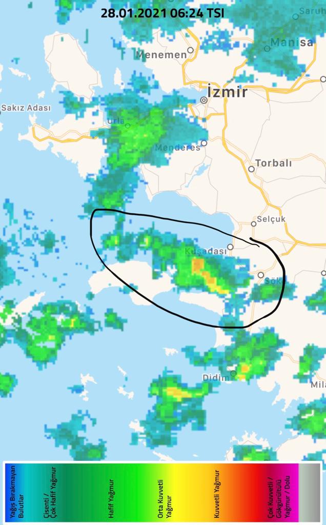 Ege kıyılarında nadir görülen kar yağışlarını 28 Ocak günü ben de Kuşadası’nda gözlemledim. Gündüz saatlerinde zaman zaman gök gürültüsü eşliğinde 250 metre rakımda devam eden kar yağışı, akşam saatlerine doğru havanın da soğumasıyla Kuşadası/Merkez’de de görüldü. Öğleden sonra oluşan bir deniz etkisi bandı saatlerce aynı bölgeyi vurdu ve deniz etkise yağışa bağlı olarak sıcaklıklar gündüz saatlerinde özellikle yağış anında çok düşük seyretti.