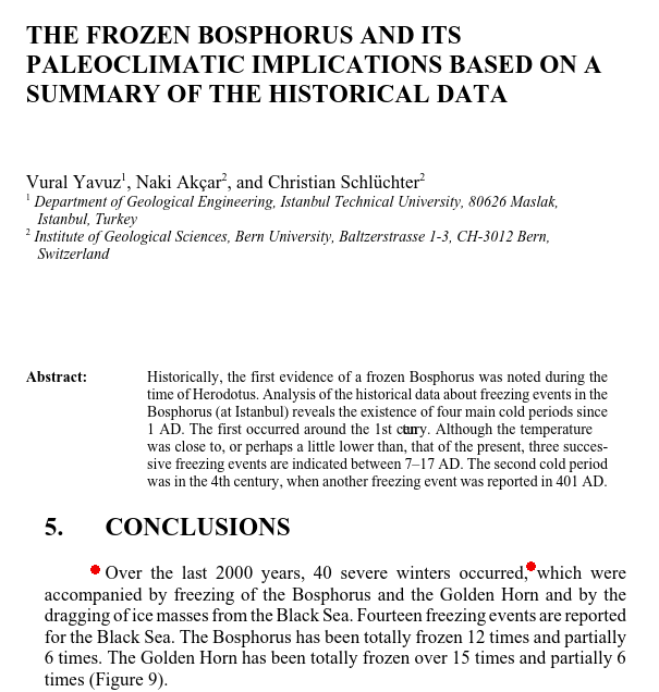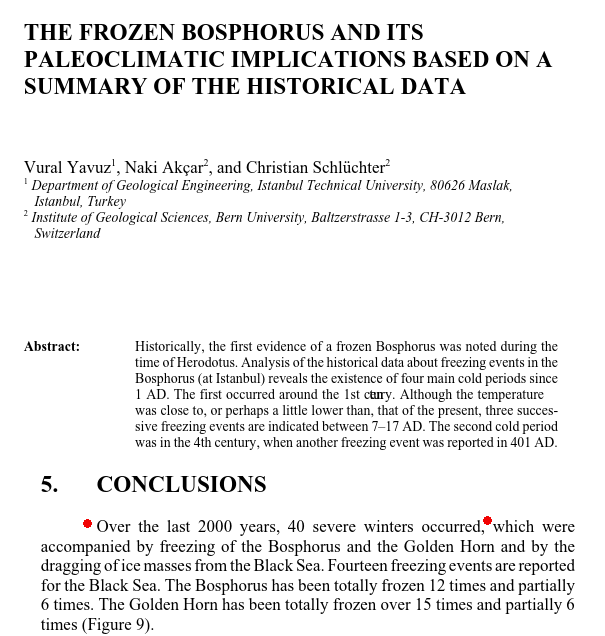Yavuz V., Akcar N., Schlüchter C. (2007) “The frozen Bosphorus and its paleoclimatic implications based on a summary of the historical data.” In: Yanko-Hombach V., Gilbert A.S., Panin N., Dolukhanov P.M. (eds) The Black Sea Flood Question: Changes in Coastline, Climate, and Human Settlement. Springer, Dordrecht. https://doi.org/10.1007/978-1-4020-5302-3_26