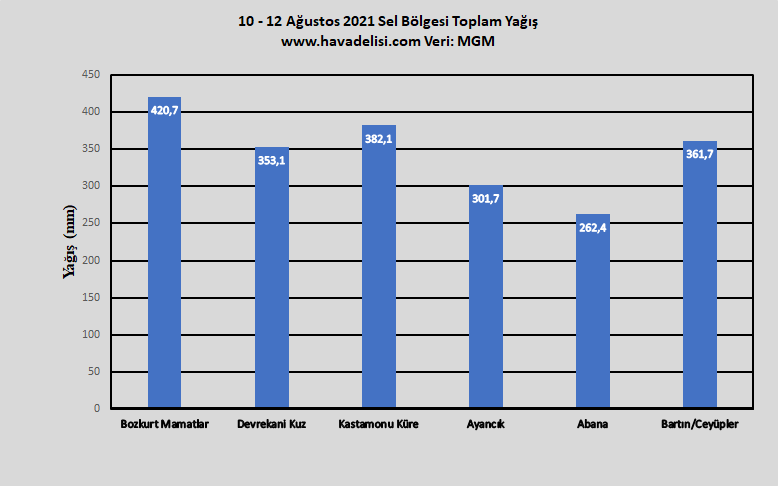 7 Ağustos 2021 tarihinden itibaren etkili olan ve 11 Ağustos’ta büyük yıkımlara yol açan sistemin hemen öncesinde Orta Karadeniz açıklarında deniz yüzeyindeki su sıcaklığının 28-29 derecelere ulaştığı görülüyor. Kuzeyden gelen serin rüzgar, deniz yüzeyinden kalkan su buharını Bozkurt’un hemen ardındaki dağlara taşıyor ve atmosferin üst katmanındaki soğuk havayla karşılaşan nemli hava, bu dağlara bardaktan boşanırcasına yağış indirmeye başlıyor.