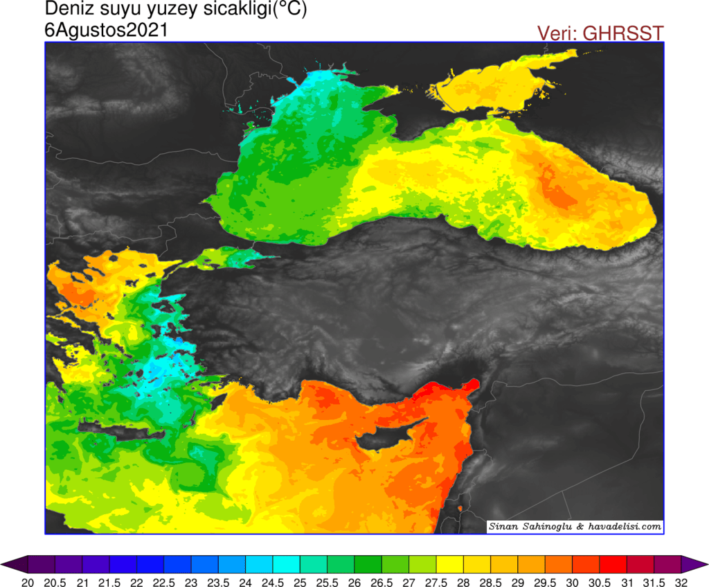 6 Ağustos 2021 tarihinde deniz yüzey suyu sıcaklıkları