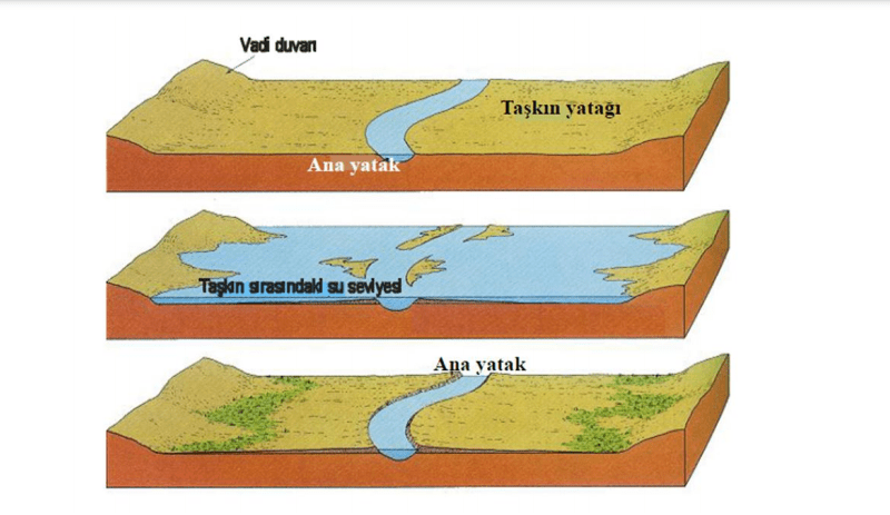 Dereler, çaylar ve nehirler, yataklarını milyonlarca yıllık süreçler sonunda şekillendirirler. Yatağın şekli ve niteliği suyun debisine, hakim iklim koşullarına ve jeolojik faktörlere göre dinamik bir yapıda olurlar. Yukarıda paylaştığımız görselde eğimi az olan, yatağı genişlemiş bir akarsu profili var. Bu tip oluşumlarda akarsu, debisinin az olduğu durumlarda yatağın küçük bir noktasında toplanmıştır ve oradan akmaya devam eder. Burası ana yatak olarak adlandırılır. Ülkemizde hakim olan iklim koşulları nedeniyle akarsuların debisi yaz aylarında düşük seyreder ve akış bu aylarda çoğunlukla ana yatakta olur.