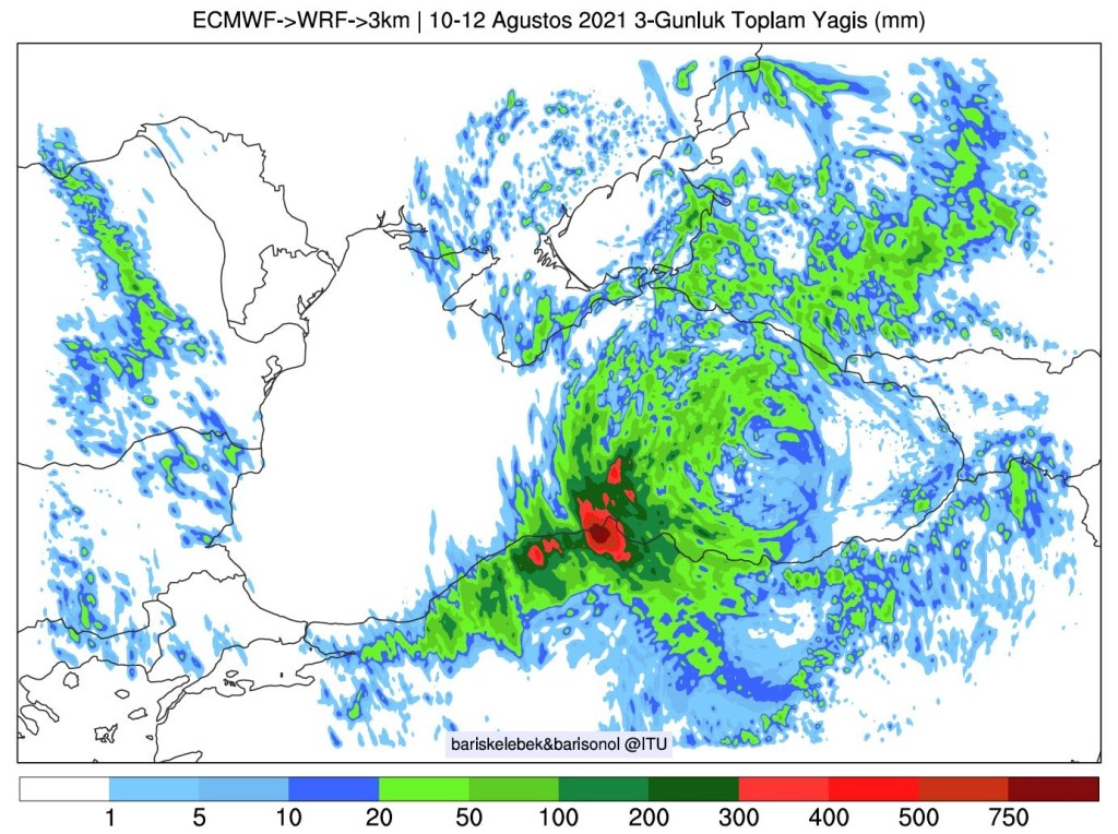 10-12 Ağustos 2021 tarihleri için Wrf modelinin 3 günlük toplam yağış tahmini. Sel bölgesinde 500 mm’ye yaklaşan değerler öngörmüş. (Kaynak: Barış Kelebek & Barış Önol- İTÜ Met. Müh.)