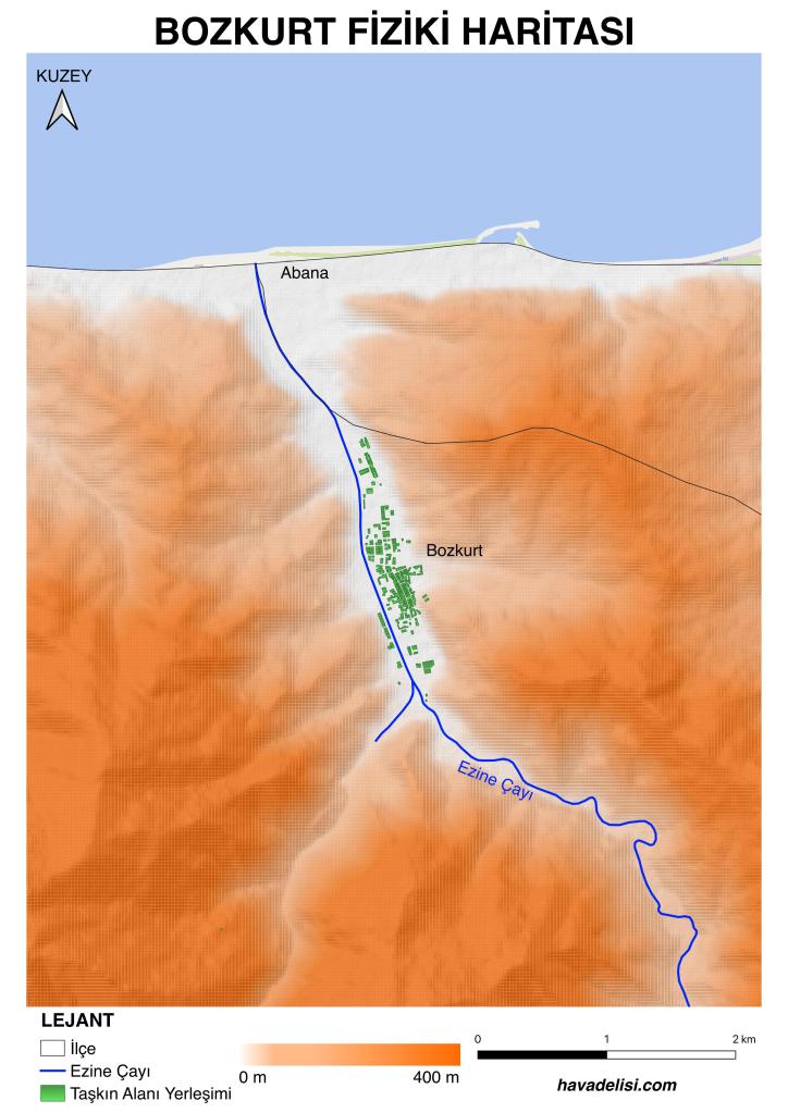 Akarsuların sürekli aktıkları yatak dışında uzun yıllarda şekillendirdikleri bir de taşkın yatakları bulunur. Havzadaki iklim koşullarına göre, taşkın yataklarında bazen çok uzun yıllar su akışı olmayabilir. Bu süre uzadıkça taşkın yataklarının tarım arazileriyle, ormanlarla ve nihayetinde konutlarla kaplanması ihtimali de artar. Bu süre bazen bir insan ömründen bile daha uzun olabilir. Ama maalesef ne kadar zaman geçerse geçsin akarsular taşkın yataklarına geri dönebilir ve oradaki her şeyi yutabilir. Eskilerin de dediği gibi; su akıp yolunu bulur. Tıpkı Bozkurt’ta yaşanan gibi… Jeolog Dr. Ramazan Demirtaş’ın hazırladığı aşağıdaki görsel, Bozkurt ilçesinde Ezine Çayı’nın ana yatağını ve taşkın ovası yatağını göstermesi açısından gayet güzel bir çalışma olmuş. Görüldüğü üzere ilçenin büyük kısmı taşkın ovası yatağının üzerinde kurulu halde bulunuyor.