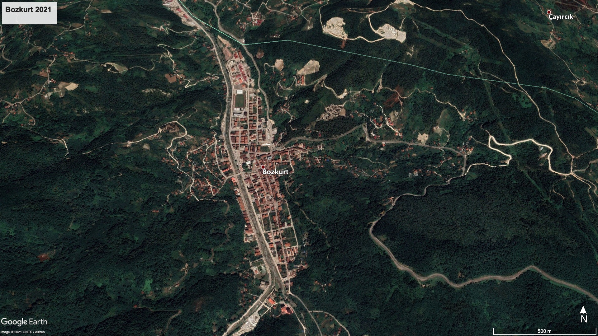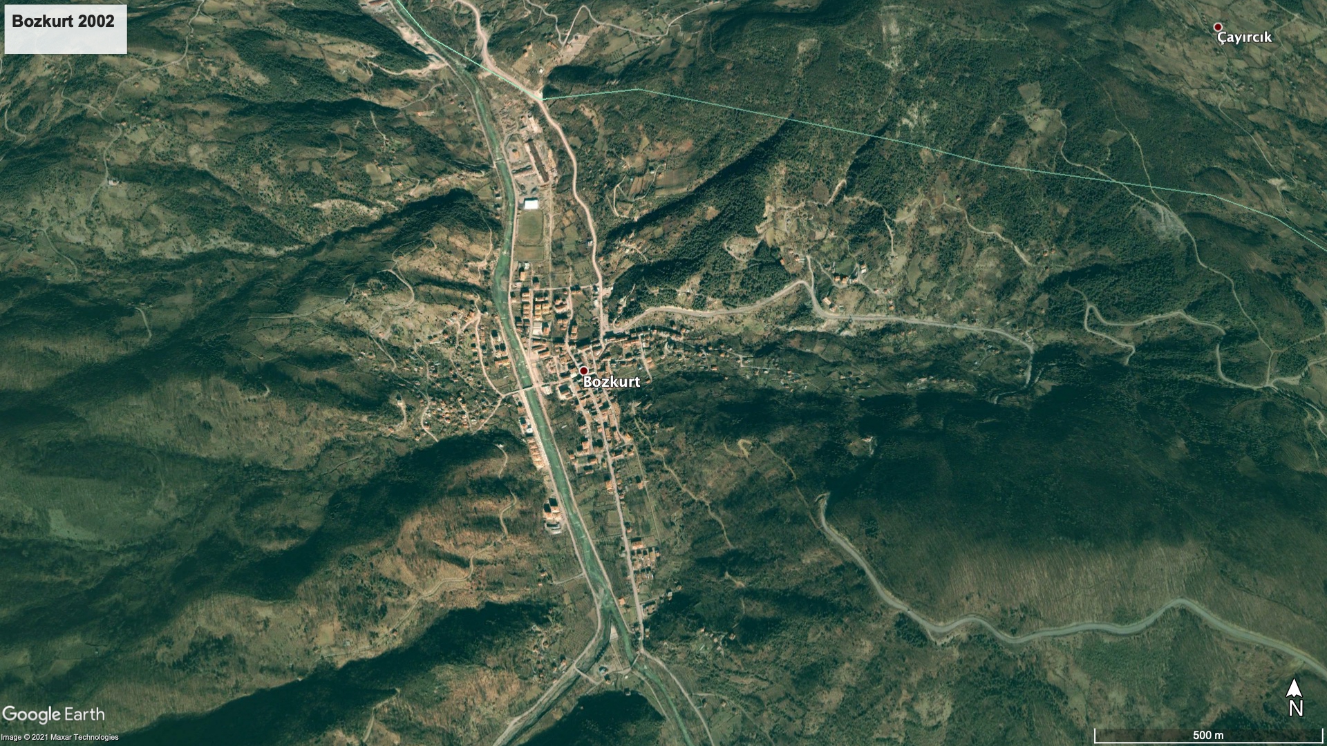 Ülkemizde 2000’lerin başından sonra büyük bir ivme kazanan inşaat sektörüyle birlikte, pek çok bölgede yeni binalar ve yaşam alanları inşa edildi. Artan nüfusun talebini karşılamak, daha konforlu yaşam alanlarına sahip olmak veya yatırım aracı sağlamak amacıyla inşa edilen yeni konutların bazılarının doğayla uyumlu olmaması da felaketlere davetiye çıkaran etkenlerden biridir, demek yanlış olmaz. Özellikle deprem bölgelerinde ve akarsu yataklarına yakın noktalarda yapılan projelerde sürecin daha titiz takip edilmesi gerekirken, denetim mekanizmalarının eksikliğinden kaynaklı olarak akıl almaz işlere girişilebiliyor. Görünen o ki Bozkurt ilçesi de bu durumdan nasibini almış. Yukarıda paylaştığımız risk haritasında, yapılan işin yanlışlığı ortadaydı. Eski Bozkurt ve yeni Bozkurt karşılaştırmasını daha somut yapabilmek için Google Earth’ten edindiğimiz görsellerde Bozkurt ilçesinin yaklaşık 20 yılda nereden nereye evrildiğine bakarsak, yapılaşmanın çok arttığını ve yeni yapılan çok katlı binaların genellikle ana yatağa doğru kümelendiğini görebiliyoruz.