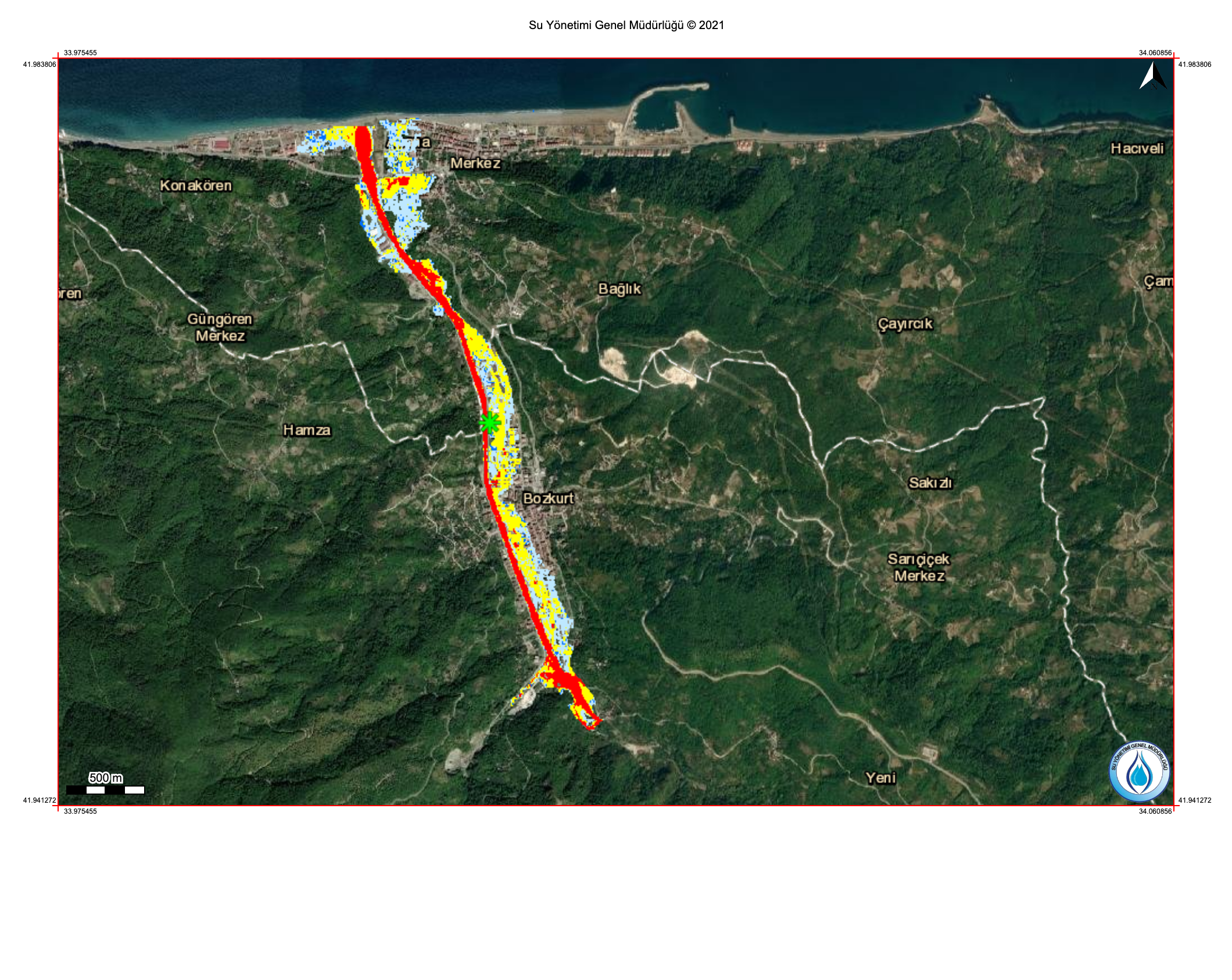 Bozkurt ve Abana ilçeleri için taşkın tehlikesi risk modellemesi 11 Ağustos 2021’deki sel felaketiyle uyum gösteriyor. (Kaynak: taskinyonetimi.tarimorman. gov.tr)